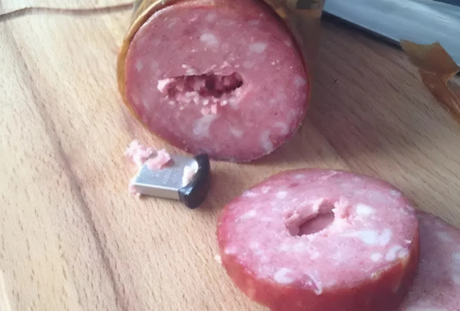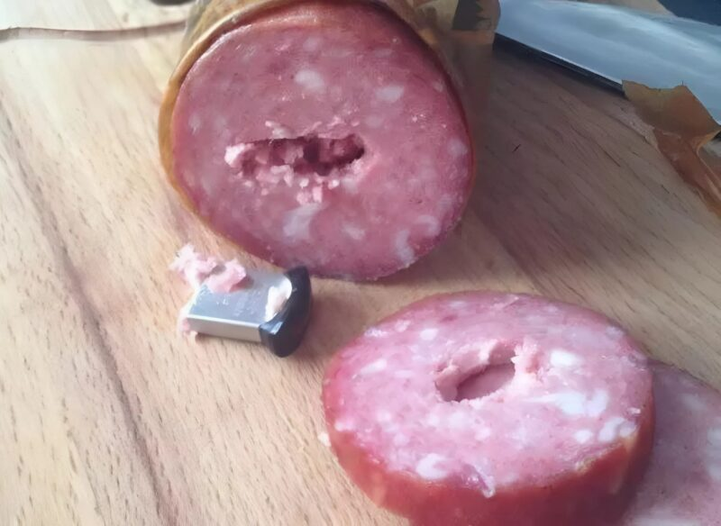Nejdřív jsem si myslel, že je to kus kovu. Začal jsem v něm opatrně šťourat a najednou jsem vytáhl… USB flash disk. Úplně obyčejný, jen pár gigabajtů. 😲Udělalo se mi špatně – tu klobásu jsem už snědl! Jak se mohl USB disk dostat do továrně vyrobeného výrobku, a to ještě ne zrovna levného?