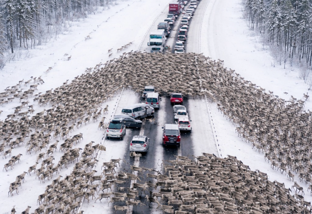 On the highway, drivers became witnesses to a Christmas miracle: thousands of reindeer ran onto the road, instantly creating a massive traffic jam: But when it became clear where the reindeer were running and what they were fleeing from, people were left in complete shock